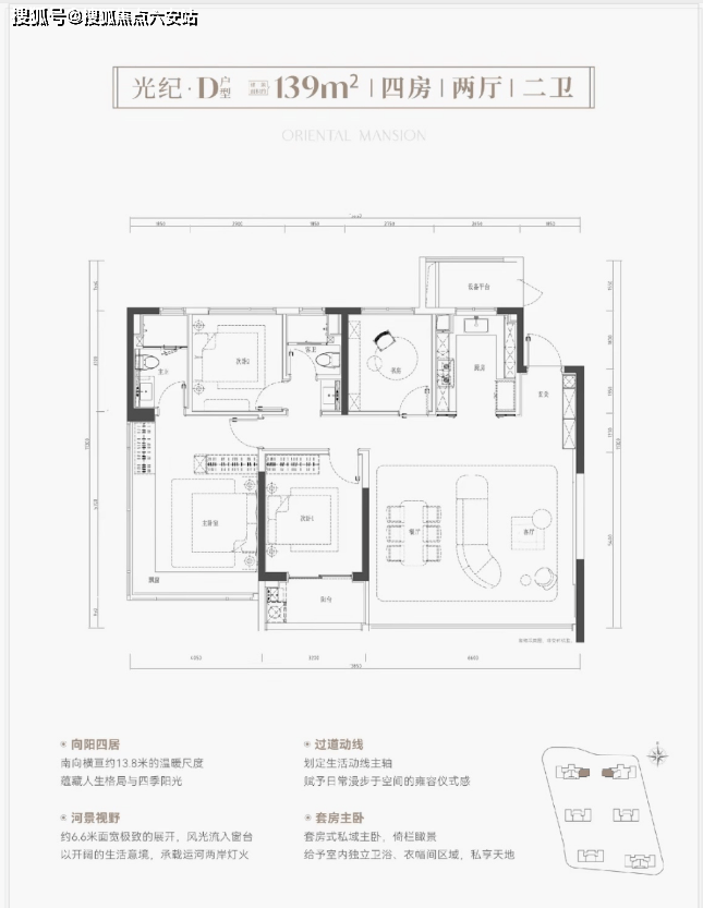 139平米“竖版”户型,得房率高达约93%,空间利用率卓越; 南向三卧设计,采光充沛,完美适配二胎及三代同堂家庭需求; 客厅面积约37平,开阔大气,并配备约2.6平独立储物间,实用性强。