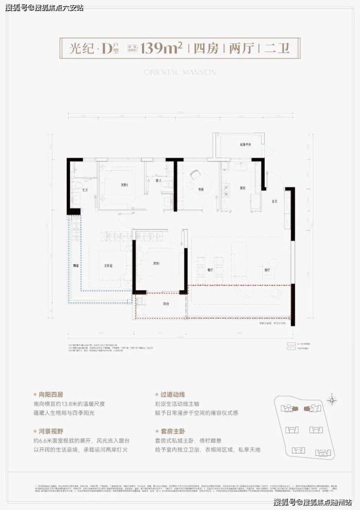 建面约120平方米户型则设计了四房且四开间朝南,南向采面极佳。而建面约139平方米大户型则打造四房两厅两卫,分为横竖两款,全部为边套,两梯两户设计。该户型得房率高达约93%,南向3个卧室,采光优良,客厅面积达到约37平方米,充分满足二胎家庭或三代同堂的居住需求。