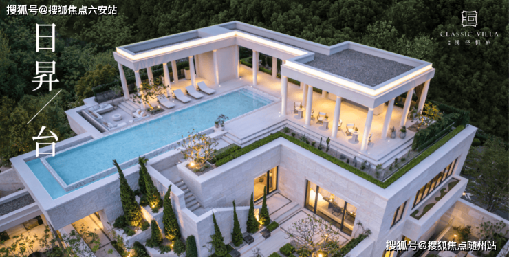 项目示范区展示了近1.2万平米高浓度公共空间,是杭州唯一一个拥有三个会所的低密社区。其中以希腊雅典卫城作为灵感来源,由错落的体块自由堆叠而成的三层会所“日昇台”,位于项目西南角的道路交叉路口,景观视野开阔,挑空的泳池和希腊式的柱体,形成了城市灯塔的形象。