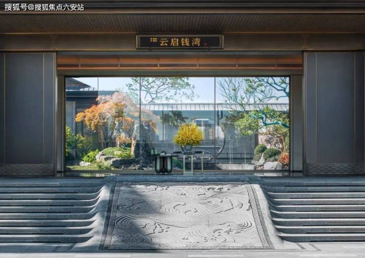 从大门开始,云启钱湾采用隆重的「重檐悬山顶」,门口台阶中间的「水纹御道」和钱江潮涌呼应。