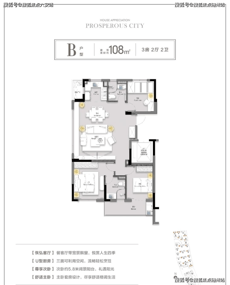 建面约108㎡打造为同面积段少见的边套产品,餐客厅一体化带飘窗,空间阔绰,家庭小聚或是亲朋来访都不会感到拥挤。