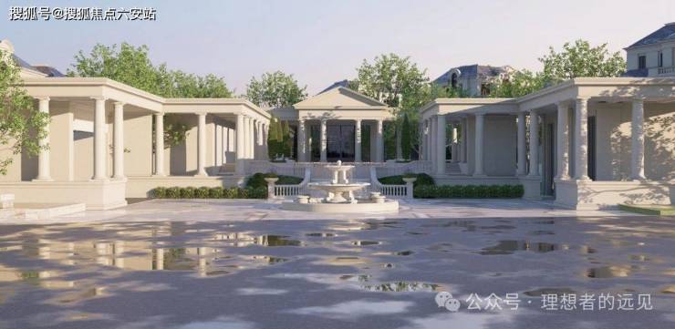 绿城·溪径恒庐做出了一条约200米的沿街界面:从楼盘大门口的喷泉广场,到沿街柱廊,一直贯通到「雅典卫城」会所。你一看这条「大门-柱廊-会所」的沿街界面就知道,这是一个价值非凡的低密楼盘。