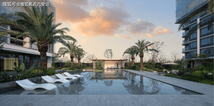 与水院相连的是中央景观泳池,6颗价值不菲的加拿利海枣树环绕池畔,每颗树直径超50公分,营造出浓烈的热带度假风情。