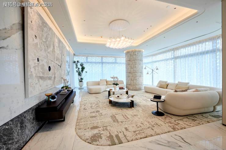 项目以“悬浮水晶”为设计灵感,外立面采用2.4米超宽曲面玻璃幕墙,搭配270°环幕落地水晶玻璃,最大化采光与观景效果,将江景与城市风光无缝融入室内。装修标准达1.5-2万/㎡,全屋满铺意大利鱼肚白石材,厨房配备德国嘉格纳高端厨电,卫浴选用瑞士劳芬智能卫浴,搭配大金中央空调、威能地暖、霍尼韦尔新风系统,兼顾奢华质感与居住舒适度,更罕见实现通燃气设计,打破商业大平层的使用局限。