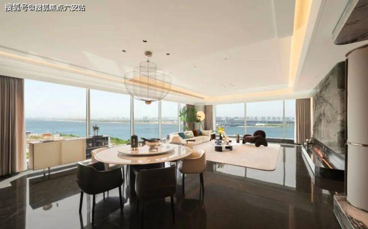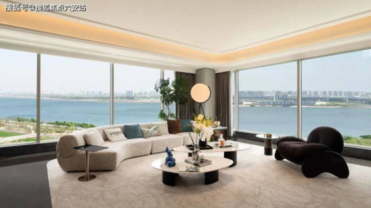 客厅:19米超大面宽搭配270°环绕视野,钱塘江柔美曲线融入弧形吊顶与奢石拼花;