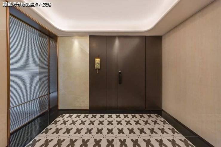水磨石地面+铝板造型吊顶,搭配模拟天光井与造型绿景,首先用一个地下光庭,打底酒店式的归家体验,入户奢石+金属背景墙,再度提升了门厅的中式礼序。