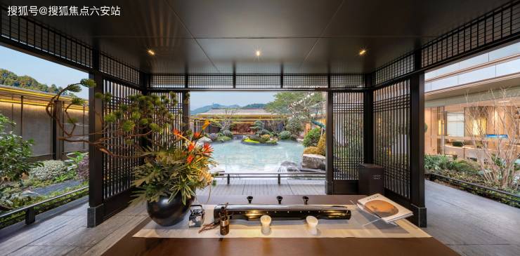 外立面采用真石材+香槟金铝板,复刻唐代宫殿的恢弘气度。三重飞檐设计搭配夹绢玻璃屏风,再现《富春山居图》的诗意画卷。