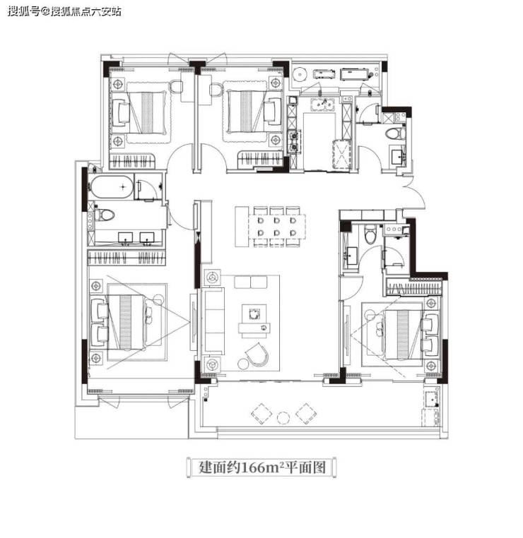 在户型设计上,约166㎡大四房设计可圈可点,得房率更是优秀,算上赠送面积可高达95%,主打一个性价比!