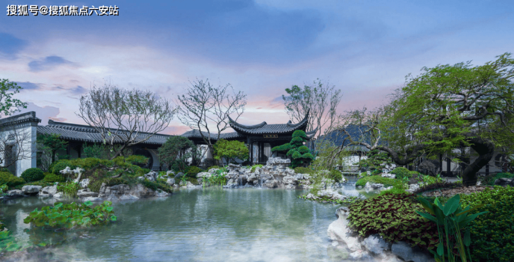 经典元素:曲水流觞、月洞门、风雨连廊串联空间,春樱、夏荷、秋桂、冬松四季有景,步移景异间尽览东方园境形与意。