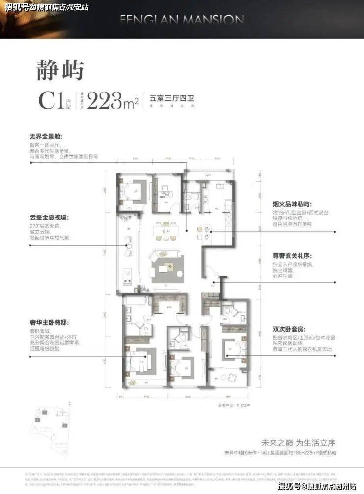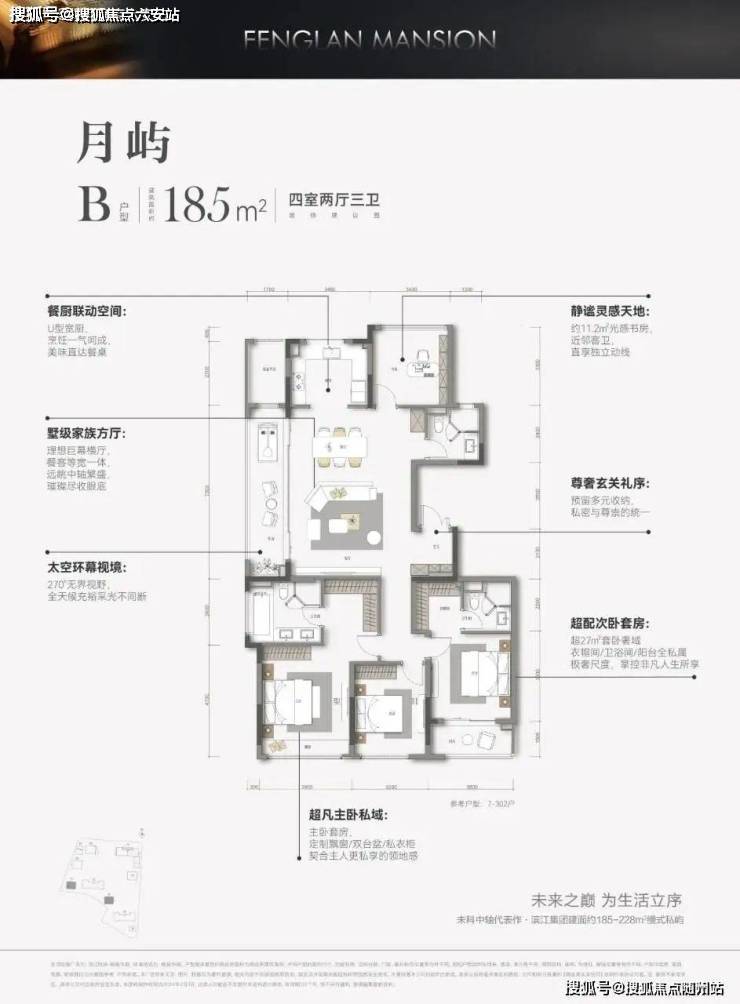 228㎡五房两厅四卫:三开间朝南,南向面宽11.5米,带独立玄关,户型整体格局类似185㎡,三套房设计,大主卧带步入式衣帽间,双阳台设计,南侧一主卧带阳台,餐客厅一体,边厅阳台7.6米,北侧同时布局两房。