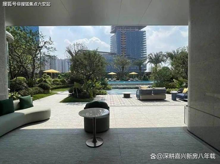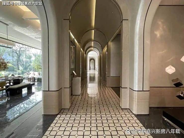 架空层空间也很丰富。7号楼架空层不仅有艺术走廊,还有独立书吧、休闲区等,往外看去就是绿植和蓝色景观水池。