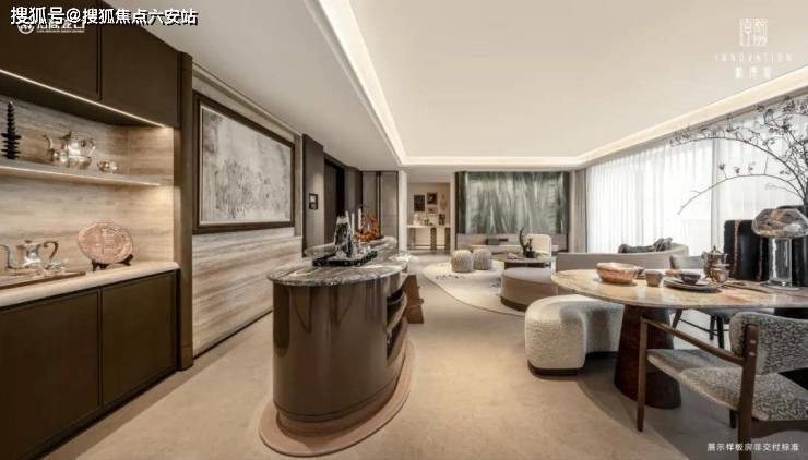 【陶砚176】取陶砚之自然璞实感,雕琢白冰玉的背景墙,客厅吊顶还原砚台造型,室内饰以瘦金体笔划装饰线条。