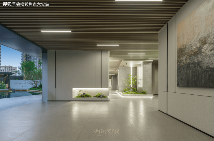 从社区整体规划而言, 潮映望月府通过景观空间的差异化分配,创造出更大的核心景观空间,演绎出“大围合”的庞大中心园林尺度,并配合不规则水景、架空层的营造,塑造出极具度假质感与休闲气质的核心景观空间。