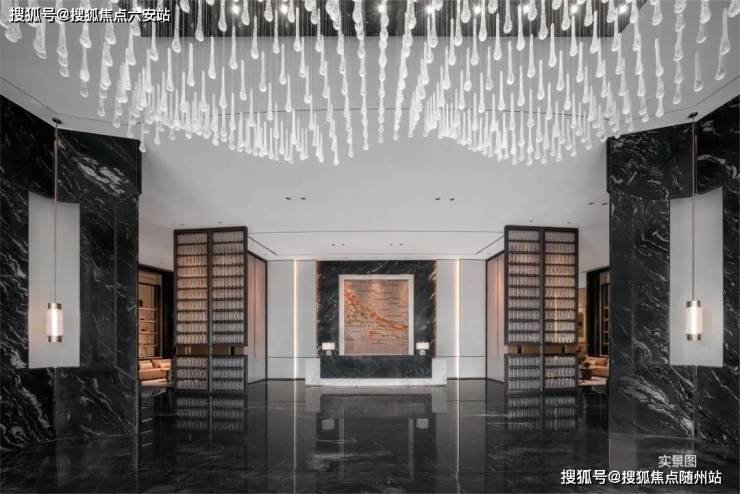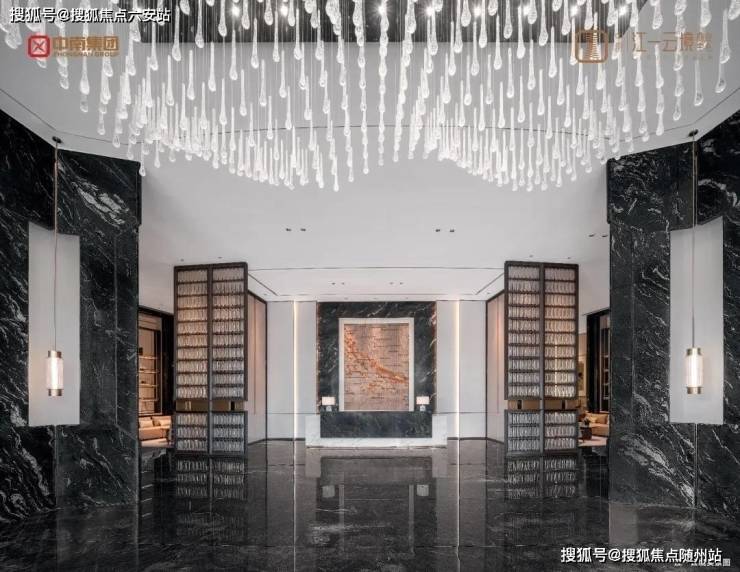 第一重奢阔门厅,巍峨门庭,中轴对称建筑徐徐开篇,中心凌云松迎宾,青松遒劲,气势恢宏;第二重超五星级大堂,近6米高的大堂,整个墙面运用香格里拉酒店专用的黑荒料奢石,碧潭金沙的地面,背景墙以纯手工定制宋瓷官窑的手法打造独特的陶瓷挂画艺术品,营造出考究、厚重内敛的奢华感;第三重独立入户大堂,奢华铺陈高贵而有专属感的私家领地,光影流转,构成恢宏的门庭礼制空间格局。