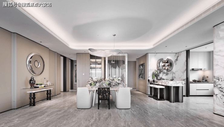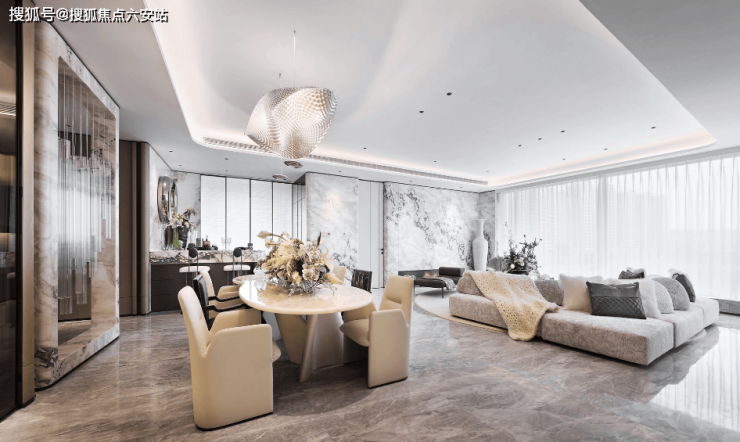 以“折衷共相,为真实而设计”的主张,溯源法国宫廷的浪漫与精致,融合轻法式风格,通过现代极简的笔触勾勒空间。雪花白大理石与雅博白大理石拼花、水纹玻璃与石材完美拼合的背景墙、多哈印象大理石地面以及安第斯雪景大理石主背景墙,营造回归生活本真的松弛之境。