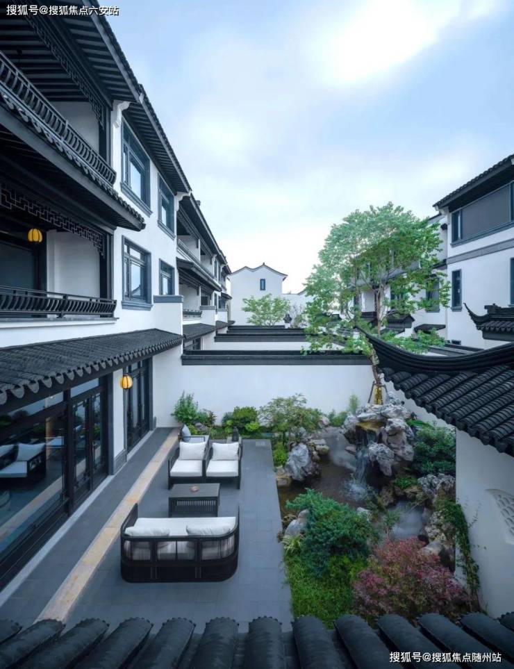 项目以宋代《营造法式》为蓝本,采用歇山顶、格栅窗、香山帮古建技艺,搭配蓝眼睛石材与铝板幕墙,形成“新宋风”建筑语言。每栋合院均享退台式立体庭院,最高达12米的垂直绿化让建筑隐于山林。