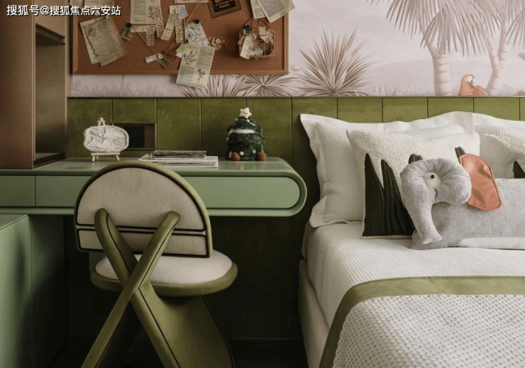 女孩房的格调更偏向“梦幻城堡”,绿意盎然,柔软的材质、丰富多彩的造型、温和的色彩、童趣的家具共同为孩子的成长与生活增添梦幻色彩。男孩房以自然丛林为主题,房中充斥着露营探险元素,以激发小朋友的创作灵感。