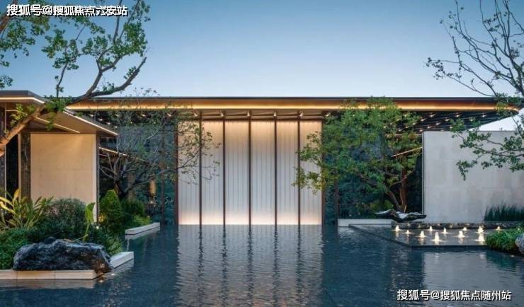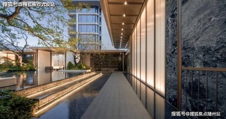 公区设计:公区已经实景呈现,进入公区首先看到的是长约40米的恢弘大门,用了大半年时间打磨而成。大门两旁铺装了大片的Prada绿奢石,使用金属线条包边,简约中又显高贵。整个园区还散落着超40多块大大小小的黑山石,也是一大景观亮点。