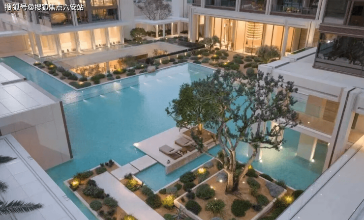 它是杭州此前从未见过的产品形态,门头、连廊、会所空间都大胆运用了大量纯色石材,园区里铺上了大片大片的冰川蓝水系,就连绿植也是很纯净的油橄榄、果树,形成了高级酒店的隐奢感和度假感。走进这座园区,就像走进了一个新世界