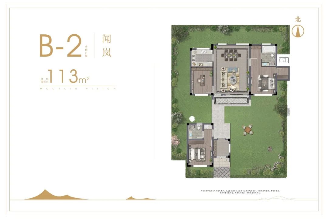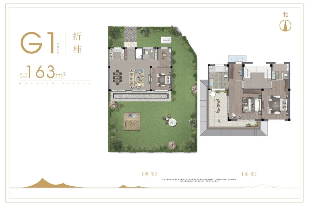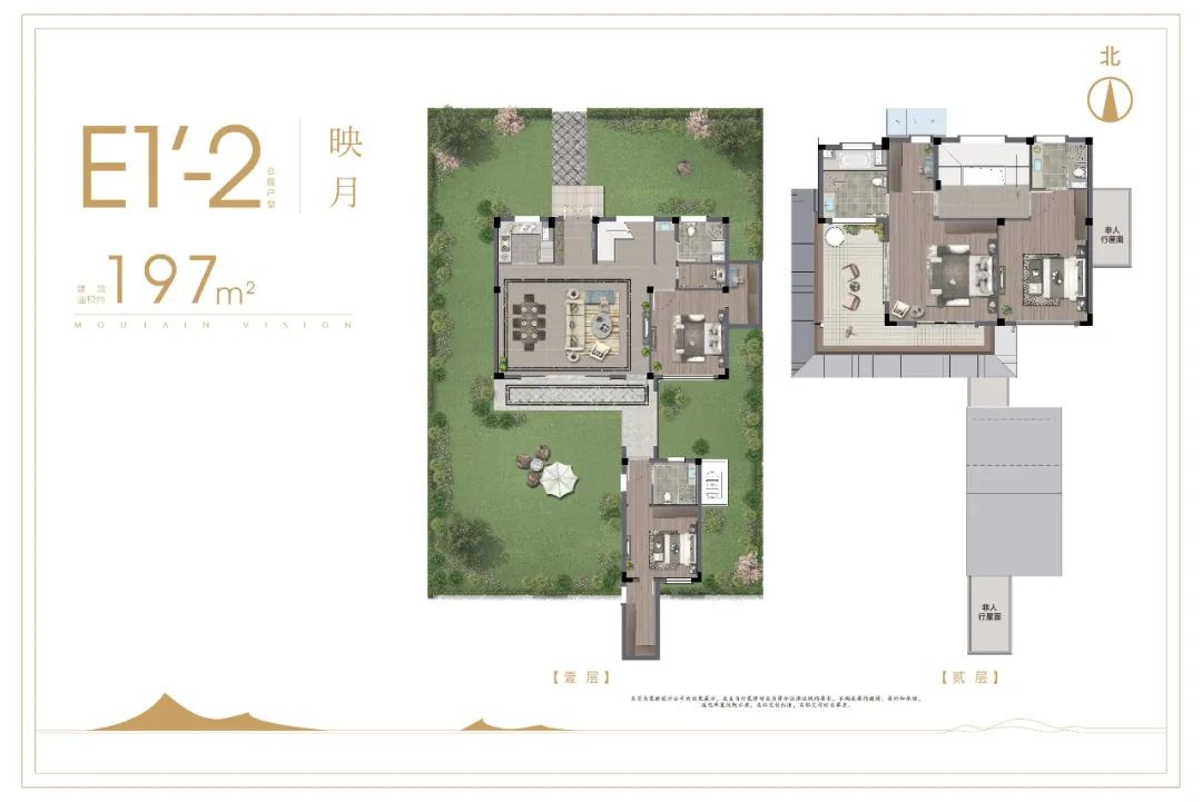 3、E1-197E1 建筑面积约197㎡【一层】庭院风雨连廊,双面四季美景餐客厅一体,双卧双套房,豪门礼遇【二层】L型南向大露台,南向双卧双套房为城市大人物而来