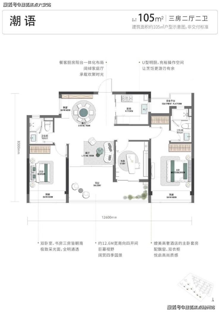 建筑面积约105㎡实现四开间朝南,约12.6米南向面宽,主次卧类双套房设计,颠覆市场对空间尺度的想象边界。