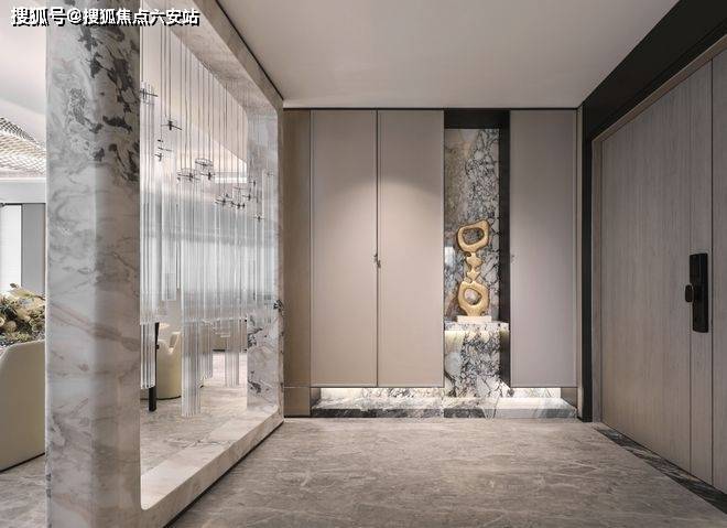 东区建面约320户型,将艺术感进一步融入日常中。特别设计的专属门厅空间,是从电梯厅延伸到家,如同一处艺廊,放慢人的情绪;室内选用了浅金色奢石(外界也称其为“芬迪白大理石”)作为主要的石材,曲面的木饰面也为浅色,整体给人以明亮感。
