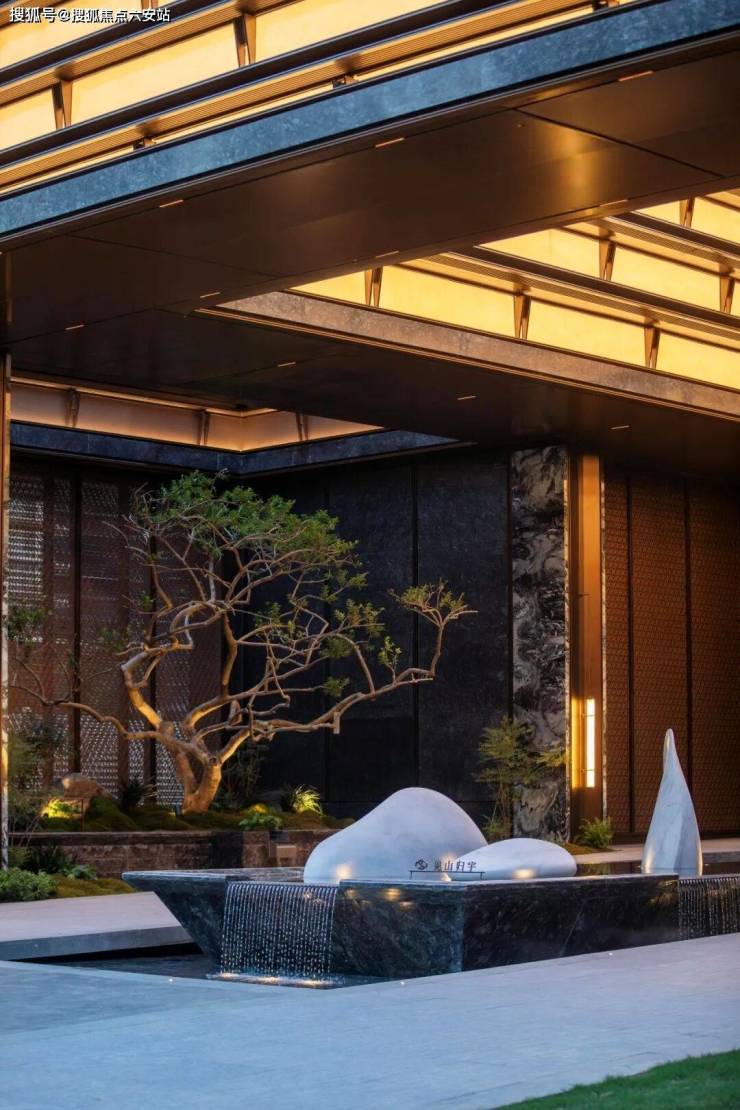 项目以约150米中央水轴贯穿东西,融合“四水归堂”传统理念,串联“十八学士下沉庭院”“银河九天瀑布泳池”等节点。入口“九五登峰”门庭高约9.5米,以巴西铂金钻奢石、六棵百年黑松营造“紫气东来”的归家礼序;下沉庭院复刻南宋夏圭《溪山清远图》,以十八学士山茶花沿涧种植,形成“涧水鸣珮,山茶照影”的东方长卷。