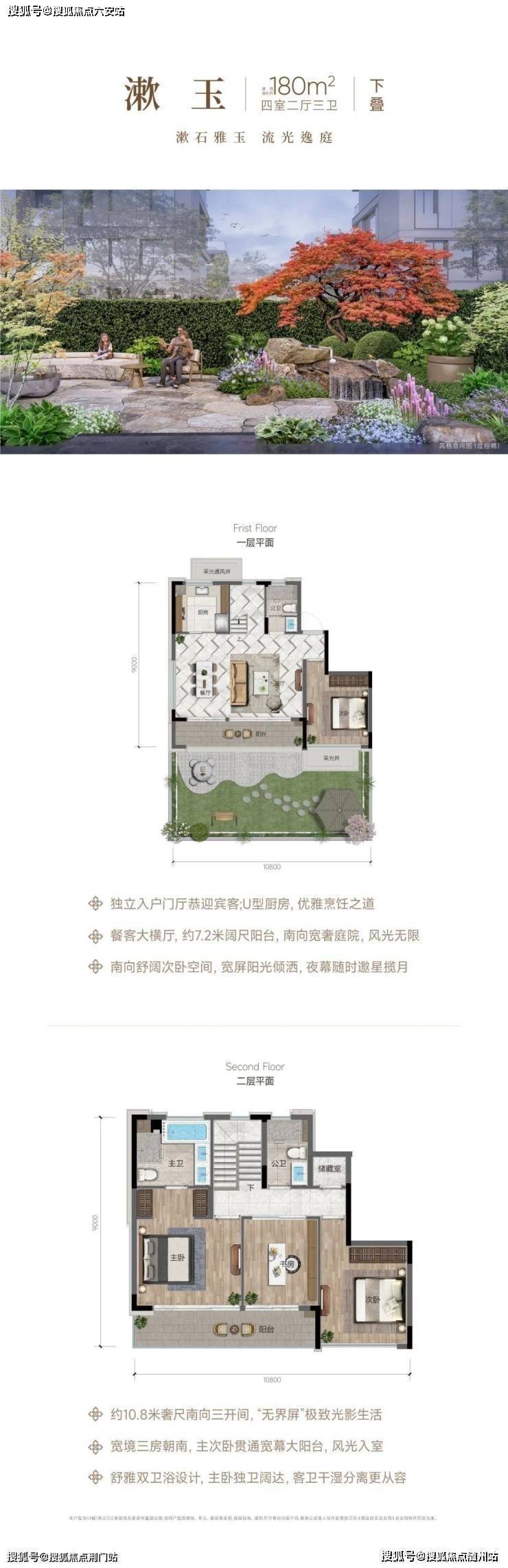 10.8米南向面宽:7.2米横厅直通庭院,地下室可改双层影音室/酒窖,主卧套房配置双台盆+观景浴缸。