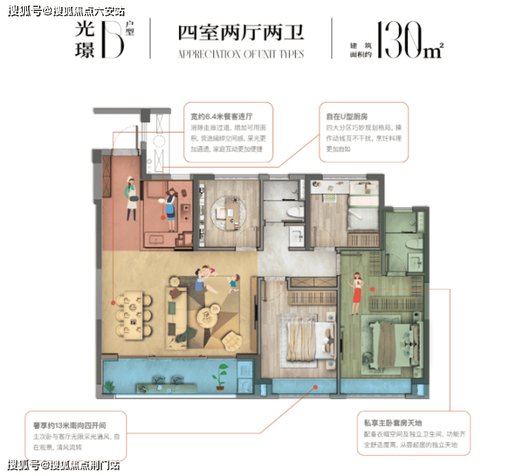 约106㎡户型点评:双联阳台约6.7米面宽,加设L型俯景面,满足晾晒、赏景、采光三重需求,LDKB一体化设计,打破各功能区域的隔离,整个空间更加开阔,开放式厨房 U型厨房,封闭敞开随心切换,高效台面设计,操作动线更加合理。