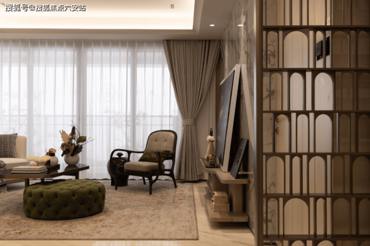 玄关处大量哑光影木面板的设置,质感满满。艺术屏风和厨房隔断门的横向线条,与主次卧室内的格栅相呼应,成了室内标志性的元素,颇具艺术感。白金沙岩板地面、冰岛翡翠岩板背景墙,主卧拼花地板,每一样都具有独特的审美价值,甚至连门把手都采用了非遗编织工艺,让房子在兼顾实用性的同时,具有了别人没有的艺术价值。