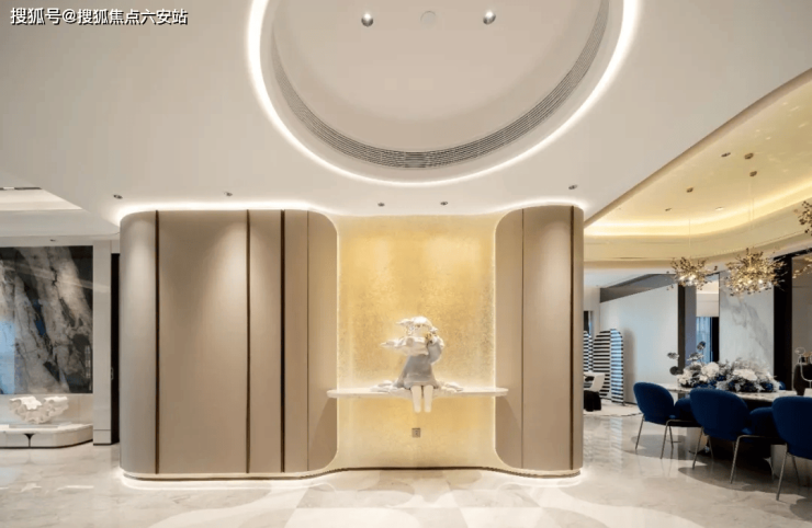 室内空间则以“全球奢石博物馆”为理念,芬迪白、喜马拉雅灰、雪山蓝等20余种进口名石贯穿全屋,主卧吊顶融入弧形波浪元素,营造“复古与摩登共生”的沉浸式艺术体验。