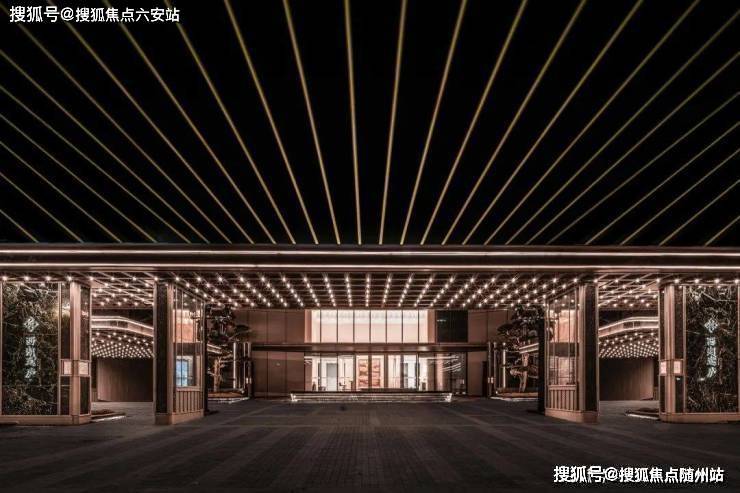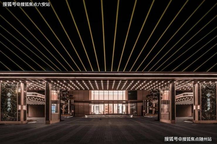 墨绿色的奢石景墙沿着两边对称排开,嵌上了粗细有致的金属线条做分割,底部是人字形纹路的铝板做拼接,到了夜晚,还能看到头顶的「满目星光」。