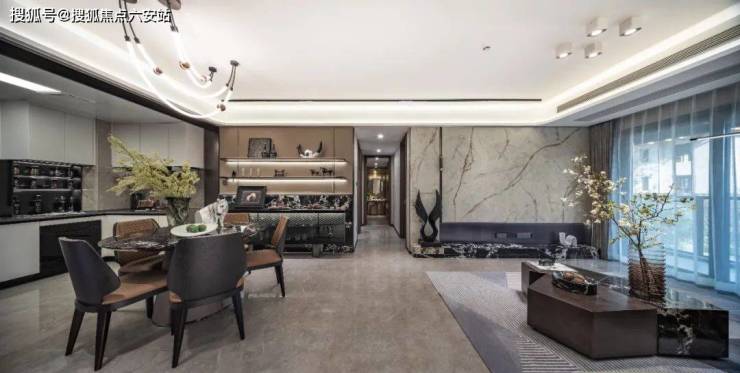 厨房灶具区背景采用大规格防污陶板层,美观又实用;厨房外整面的餐边柜既能增加收纳空间,也可以成为主人的品味展示区,日咖夜酒,打造专属于你的精神领地。