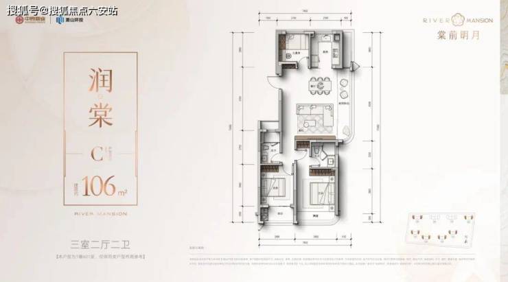 建面约106㎡边套,全明采光,三面观景。市面106方多为中间套,棠前明月却创新打造全边套户型。约6米宽屏阳台衔接LDKB大边厅,270°曲面屏全景窗,引入充沛自然光与景观视野,空间简净而宽舒。主卧套房配备奢阔卫浴与270°曲面屏飘窗,次卧亦可享观景阳台,真正做到“小面积、大奢享”。