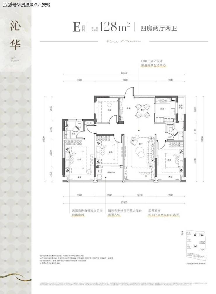建面约128方四房两卫户型