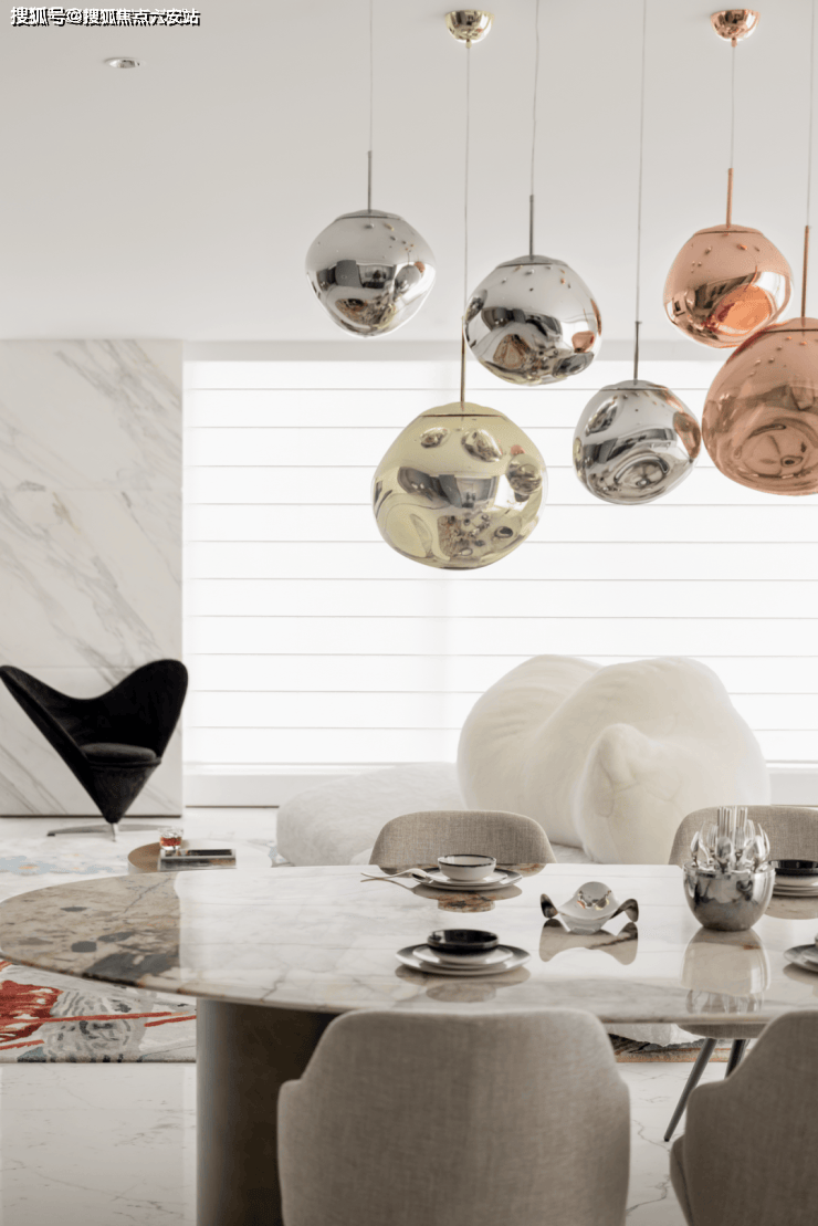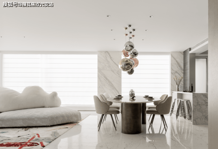 白色的大理石墙面,奢石餐桌,白色的沙发,开放自由的客餐厅承载着社交、娱乐、生活起居等分享型的空间属性。