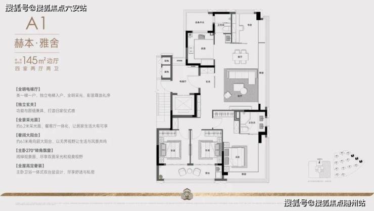 建面约145㎡的户型:项目采用创新的"两梯两户"设计,通过巧妙的空间规划实现类一梯一户的尊享体验。双电梯厅以防火门分隔,确保住户私密性。