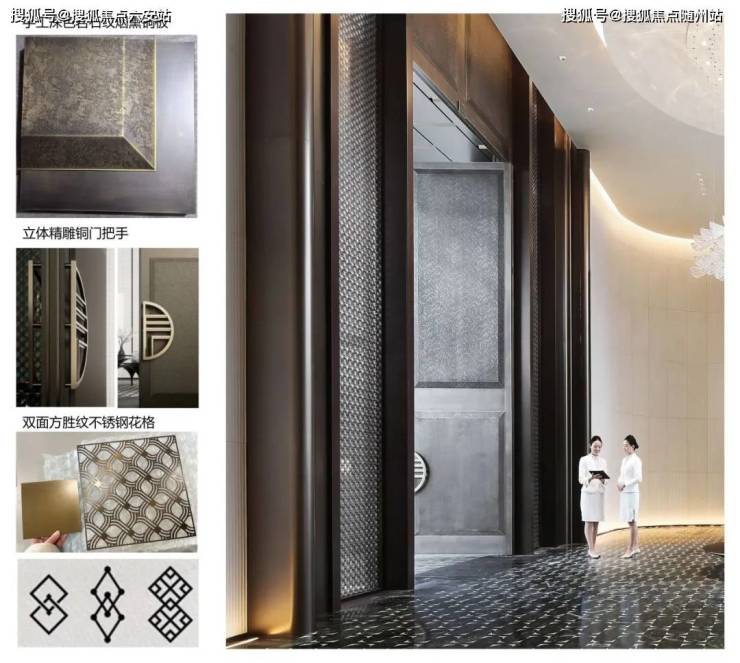 此外,整扇大门采用铜艺精雕,以水波为纹理,两侧夹丝玻璃融入了中国传统吉祥纹“方胜纹”,演绎雅贵的隐奢。