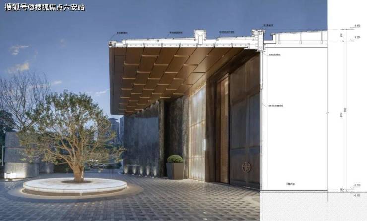 门头上方约7米的超尺度悬挑雨棚,更是通过精密计算,在横纵关系之上找到设计的平衡点,让挑檐与门庭相互平衡,形成丰富而饱满的整体关系。