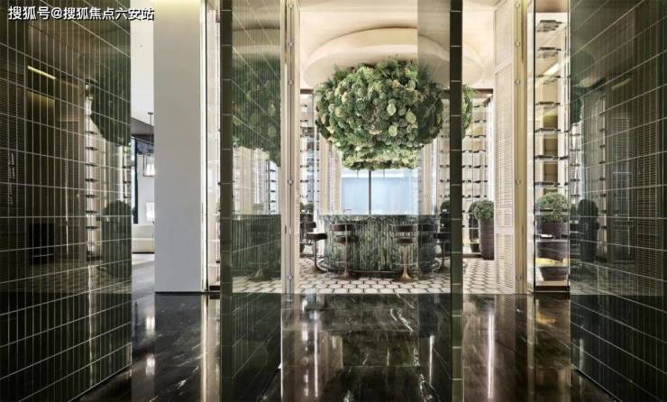 垂吊式“永生花”亭亭如盖,玻璃盒子式通透酒架隐隐划下空间界线,隐奢感扑面而来。