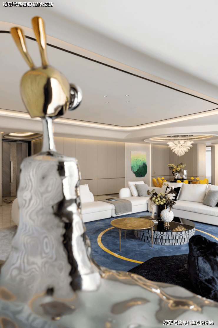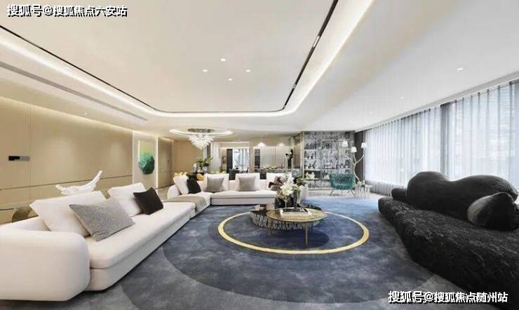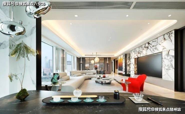 约300㎡“观湖”,谢柯打造;另一款是更宽舒的约412㎡“行云”,出自邱德光。尤其是约412㎡“行云”,无论玄关处雪花白、劳伦黑金、金世纪的大胆拼花,瓦楞式的波浪形电视背景墙,还是吸睛的普拉达绿石材吧台,全屋随处可见出色审美和奢华材质的完美结合。