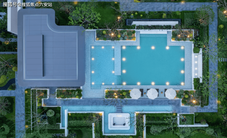 下沉庭院引光入地,书吧/瑜伽室/SPA馆环水而建,午后斑驳树影坠入涟漪