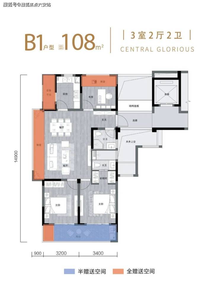 三室两厅两卫,赠送13.9㎡,实得约120㎡。主卧带独立衣帽间和卫生间,宽约6.6米南向阳台,兼顾功能和享受,约32㎡餐客厅空间,带约6.3米大飘窗。