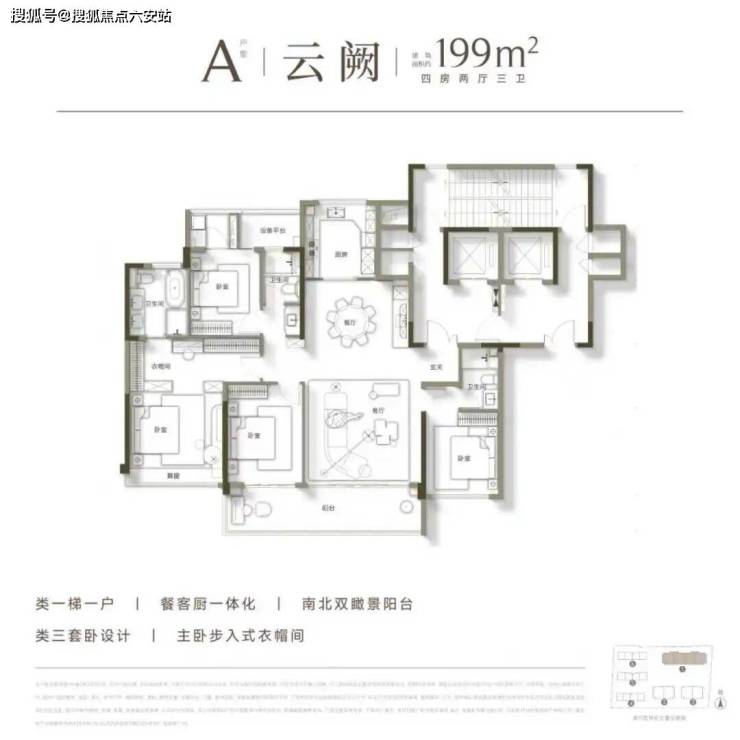 首开(建筑面积约)199㎡A户型,四房两厅三卫设计,拥有豪华双套卧+南北双阳台,甚至每户还赠送储藏室,据说实用率高达92%。