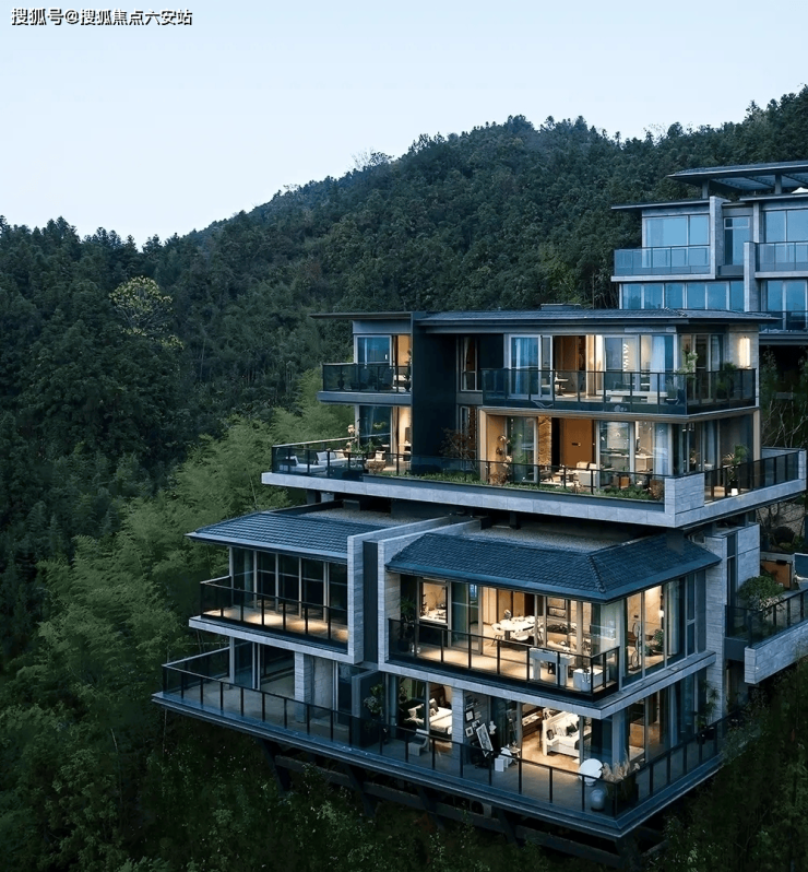 设计理念:以东方风骨为魂,现代极简为形。采用灰色石材、铝板与大面积玻璃幕墙,打造如“山间水晶盒”的透明建筑群,每栋依地形定制朝向,实现270°环景视野。