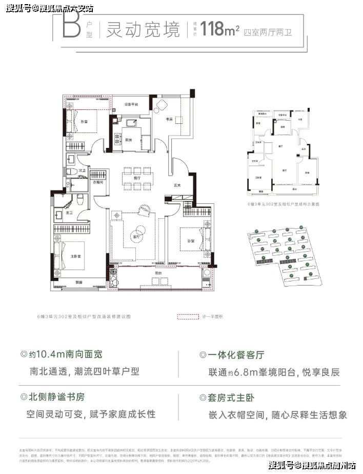 建面约118㎡四房户型, 经典四叶草全明户型,动静分区,南北通透,南向开间约10.4米。