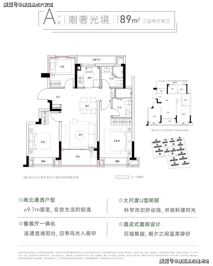 89㎡三房两卫:三开间朝南,6.8米景观阳台,主卧套房设计,总价仅170万起;