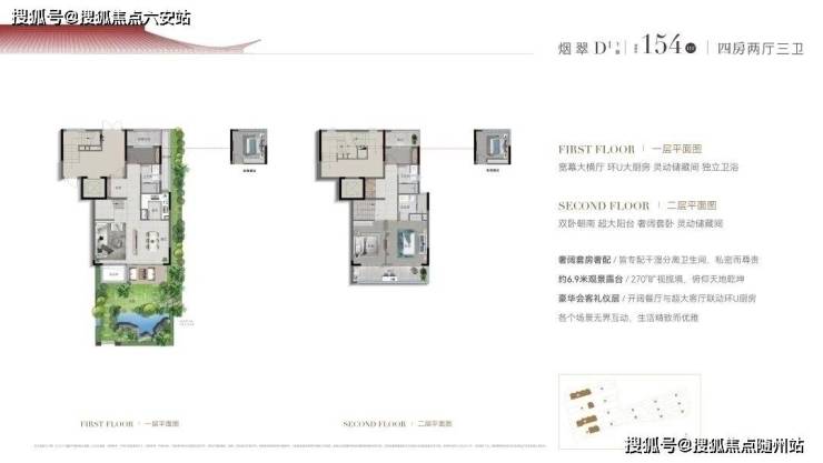 比如建面约170㎡的双层下叠四房两厅三卫,约9.7米面宽,三开间朝南的大四房格局。首层餐厅、客厅、品茶厅三个空间横向舒展,有机组合、互不干扰,单层就撑起了大平层的排场;窗外,还自带一个约9.7米宽的超大花园,满足各种野趣需求;二层是3个房间朝南,奢配约5.6米大阳台,两房联动,舒适自然。
