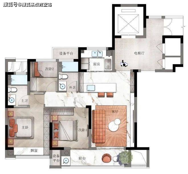 户型做到了四开间朝南。餐客横厅、次卧和主卧套房一字排开,一边是全家人的互动中心,另一边是属于个人的私享区。