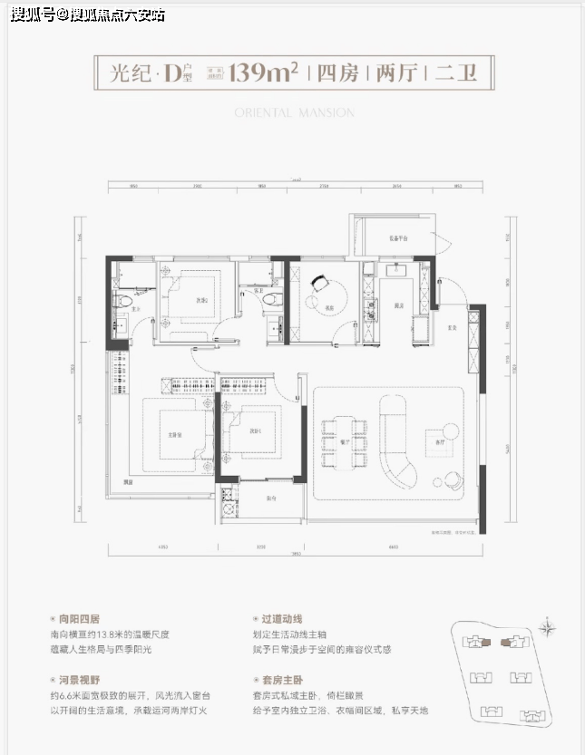 约139平米的户型分为横竖两款,均为边套设计,两梯两户,尊崇感与私密性并存。“横版”户型拥有四开间朝南、大方厅、L型转角飘窗的“全景舱主卧”以及超级双联阳台。